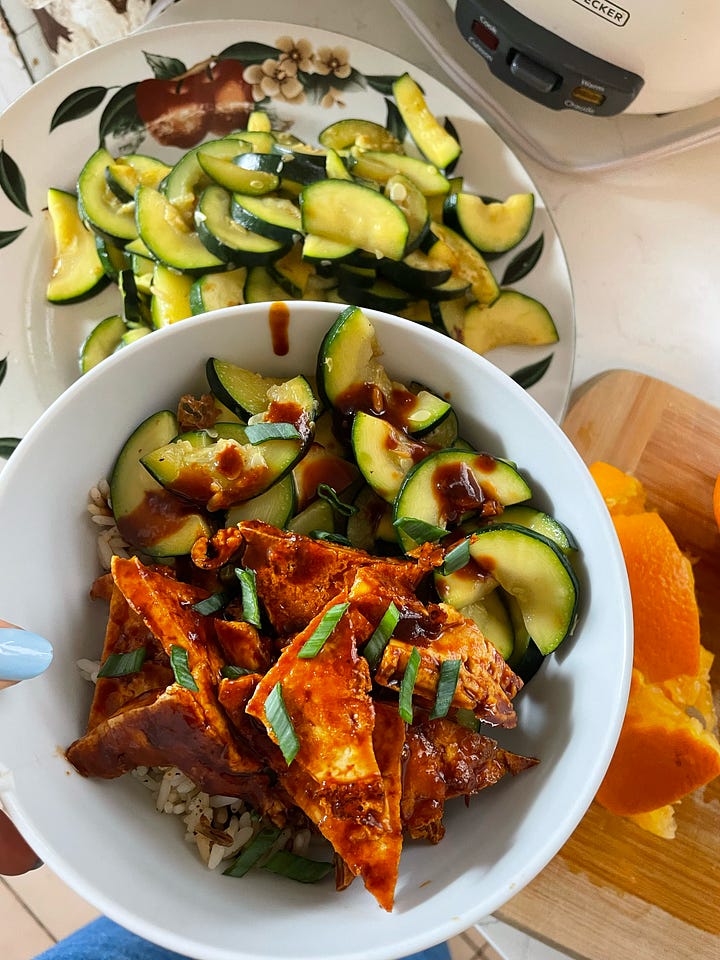 this works with any vegetable but i love sautéing zucchini after i fry the tofu and just drizzling a bit of sauce on top. honestly this is such a perfect recipe. justine snacks i love you