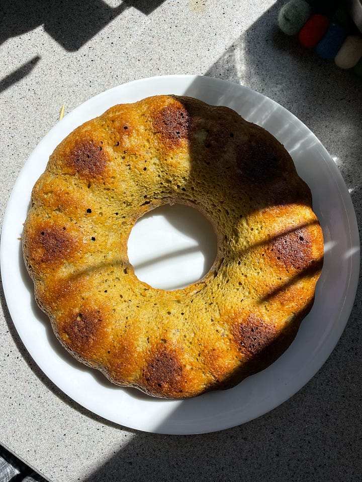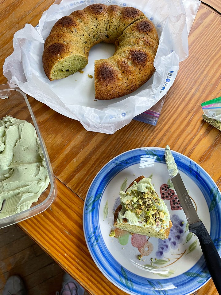 my boyfriend makes the most wonderful lemon coffee cake from his grandmother’s recipe, so i was super scared of attempting something similar, and i also honestly never bake cakes (i find them intimidating for no reason). for his birthday last week, i wanted to do a pistachio olive oil coffee cake, and this recipe was perfect. i don’t usually make recipes from sites i don’t know without testing them first, but this honestly came out perfect as a last-minute birthday cake. i also needed something with minimal components so i could transport it in my friend’s van with all my gear because my band was also playing a show that night. (feeling very my weekend as a 23-year-old in toronto, in a bad way)