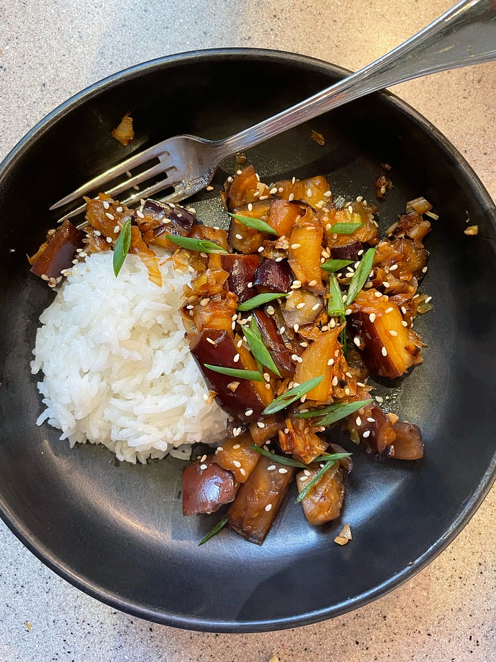 serve with green onions + sesame seeds on white rice! i also did a just eggplant, no protein version of this after getting home from a conference where i got my period while giving a 15 min talk and free-bleeding in my new sezane pants, so not in a mood to cook meat, and i forgot that you’re allowed to top things with a fried egg. which would have been so good. don’t make my mistakes